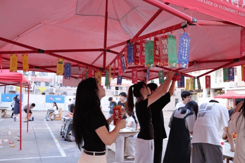 本次活动包含“投壶礼射”“玉兔套圈”“中秋灯谜”以及博饼等“玉兔套圈”环节,参与者手持彩色套圈,瞄准前方礼品,每一次成功的套中都伴随着阵阵欢呼与掌声,现场气氛瞬间被点燃。“中秋灯谜”区人头攒动,热闹非凡,灯谜中既有关于中秋习俗的趣味谜题,也有富含哲理的文学典故。经典的博饼环节以其独特的游戏规则和丰富的奖品,激发了学生们的参与热情。在闽南地区,博饼不仅是中秋节的传统习俗,更是一种文化传承和社交活动。在骰子的滚动声中,每一位同学都深刻体会到了学院家文化的温馨与包容。