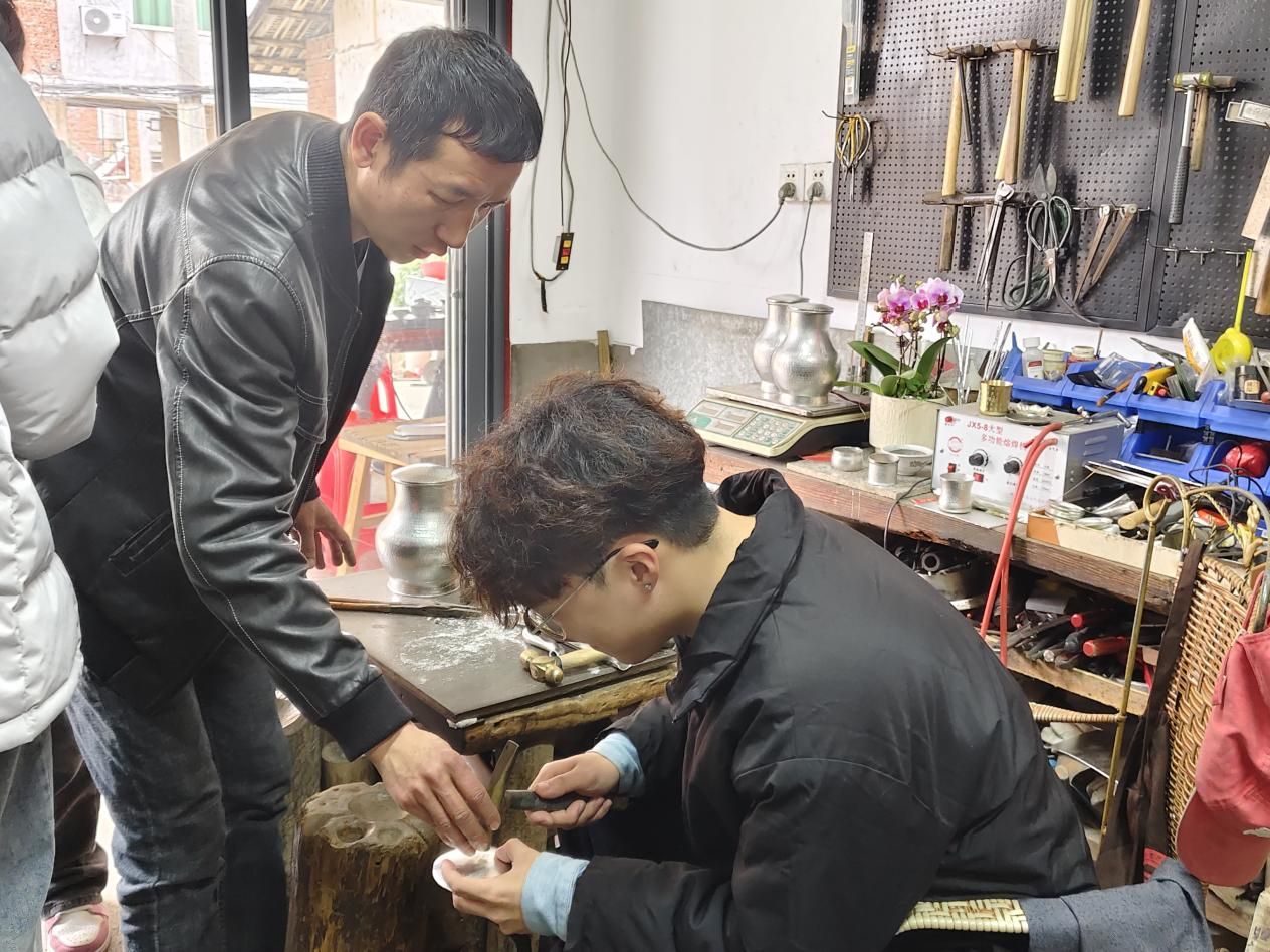 实践活动队前往四堡镇雾阁村体验雕版印刷和锡器制作。省级代表性传承人马恩明和马华强向我们介绍起锡器工艺并现场展示锻造工艺。四堡镇是中国四大雕版印刷基地之一,也是首批中国印刷博物馆福建印刷文化保护基地,雕版印刷先后被列入“第一批省级非物质文化遗产名录”“国家第二批非物质文化遗产名录”。雕版印刷技艺省级代表性传承人马力也带领我们体验了雕版印刷全过程,选纸、上墨、印刷,每一个步骤都体现出古人的智慧。
