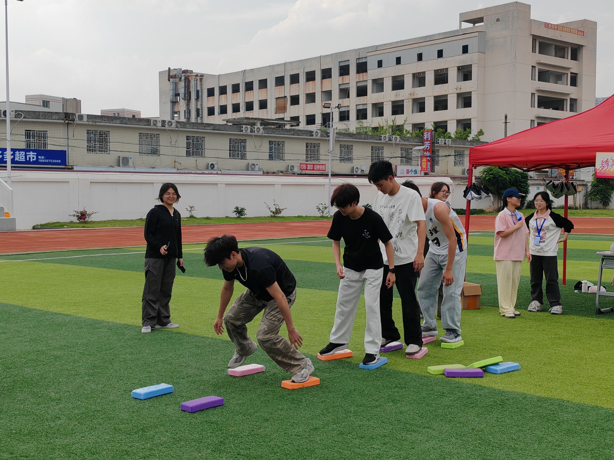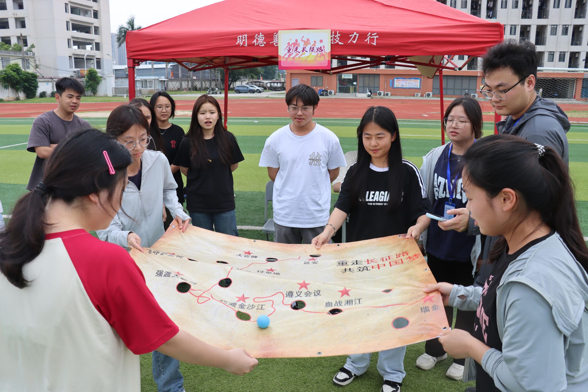 本次运动会巧妙结合红色历史与趣味竞技,设置了五个特色项目。“重走长征路”考验团队默契,队员们需协作控制画布,护送“中央红军”网球安全抵达延安;“飞夺泸定桥”模拟红军英勇战斗的场景,参赛者利用有限木板完成15米“渡江”挑战;“烽火传军需”再现战争年代物资运输的紧张氛围,队员们接力运送“军需物资”;“战场急救护”培养应急救护能力,学生们在担架运送和包扎任务中学习实用技能;“迈向新时代”则象征新时代青年勇往直前,团队成员需在不触地的情况下完成集体移动。各项目既富有趣味性,又蕴含深刻的教育意义。