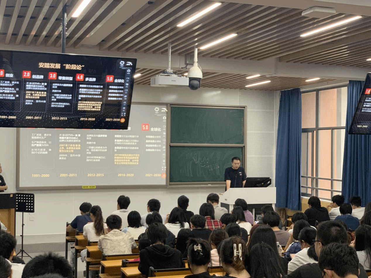 安踏物流有限公司的工作人员首先介绍安踏集团作为一家国际知名运动品牌的发展历程、发展布局、企业价值。随后介绍集团物流发展战略,并邀请学姐分享在安踏的工作经验,为同学们择业提供建议。最后详细介绍了本次校招招聘岗位需求和薪酬待遇,鼓励学生积极应聘。
