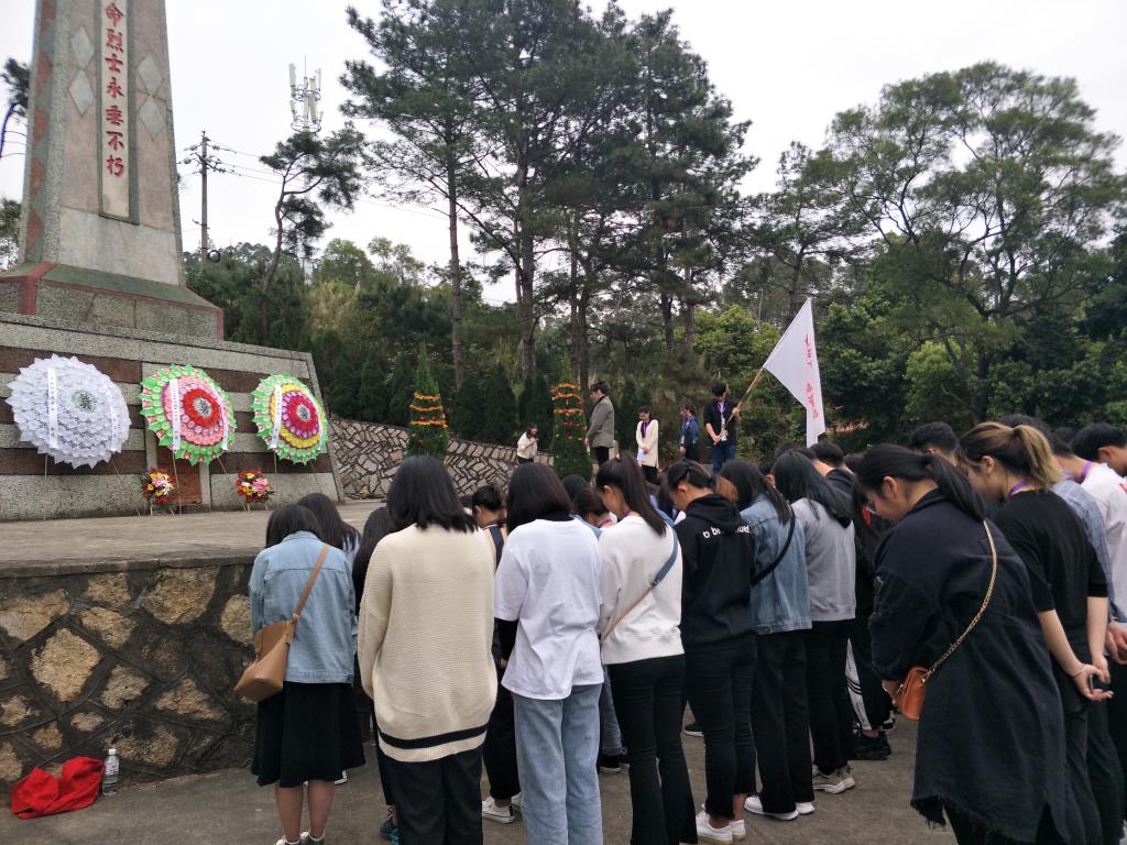 此次扫墓活动由辅导员林静带队,全体人员着装素雅,整齐有序步行前往。到达烈士陵园,纪念碑上“革命烈士永垂不朽”几个大字刚劲有力,在周围那郁郁葱葱的树木下衬托得更加醒目。仰望革命烈士的墓碑,同学们心情激动,思绪万千。列队整齐后,悼念仪式在学生会主席余明君主持下,庄严而肃穆的氛围中有序进行。首先学生代表敬献花圈,全体师生向革命烈士深深三鞠躬,并默哀一分钟,表达了对先烈的深切哀悼和无尽的敬仰之情随后团总支副书记黄保壤致辞并带领同学们宣誓“祖国至上,诚实勇敢,自律自强,奋发有为,誓做栋梁,复兴中华,再造辉煌”。