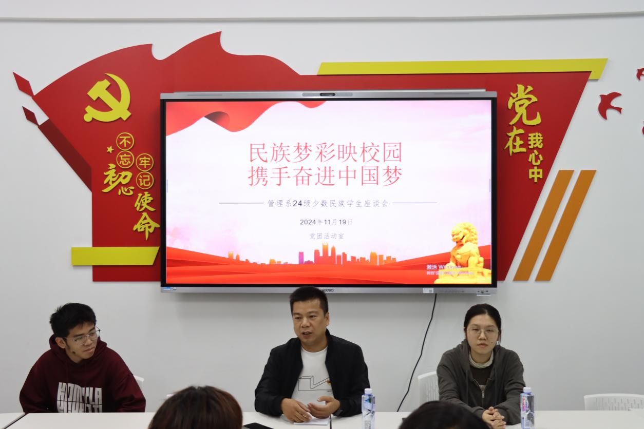 为加强民族团结,促进各民族学生之间的文化交流与融合,共同携手为实现中国梦贡献力量。管理系于2024年11月19日在党团活动室开展“民族梦彩映校园,携手奋进中国梦”少数民族学生座谈会。管理系党总支副书记蓝开强、辅导员钟睿及2024级少数民族学生出席本次活动。