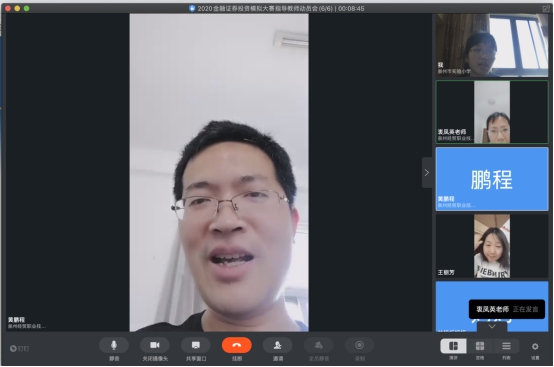 会议由管理系综合办主任黄鹏程老师主持,黄老师分享了历年来指导证券投资模拟大赛的经验,并通过比较实盘操作和模拟竞赛的区别强调了证券投资的高风险性,要求各位指导老师在4月21日前通过在线直播的形式给所指导的同学们召开动员会,除了说明比赛赛程、进行证券交易和证券分析指导,还要着重和同学们强调实盘交易的高风险性,由于在校期间尚未系统掌握证券投资分析的方法,要求同学们只能采用模拟盘形式训练、参赛,不要参与实盘交易。之后,黄鹏程老师热心解答了指导老师反馈的热身赛阶段遇到的问题。通过本次动员会,指导老师们进一步明确了指导任务,提高了竞赛指导能力,虽然受疫情限制暂时难以开展现场指导,但是各位老师热情高涨,将通过加强远程指导和答疑,帮助同学们更好的参加“2020金融证券投资模拟大赛”,并在比赛中更好的训练证券投资分析和证券交易的能力,争取获得更好的成绩。