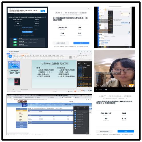 虽然受到疫情影响无法进行面对面的交流和指导,但是参赛师生热情高涨,积极通过微信、钉钉等在线通讯工具和在线操作平台进行训练和比赛。指导老师积极通过直播讲解比赛赛程、软件使用方法、证券交易流程和投资分析方法,解答同学们在比赛中遇到的问题,组织同学们一起交流对当前市场的看法和参赛心得,帮助同学们更好的参加比赛。经过一个月的激烈角逐,我院“职业韭菜20年”、“随便不随便”等32支队伍在区域选拔赛中成功晋级。