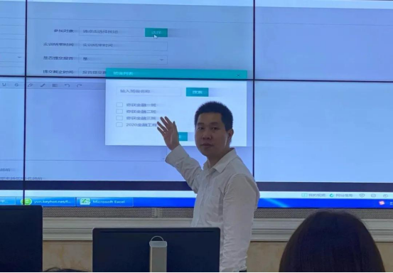 讲座结束后奇获网络科技校企合作部经理卓隆锋为泉州经贸职业技术学院经管系金融教研室主任王丽芳老师、管理系综合办主任黄鹏程和金融投资全体老师介绍奇获实训系统使用操作。