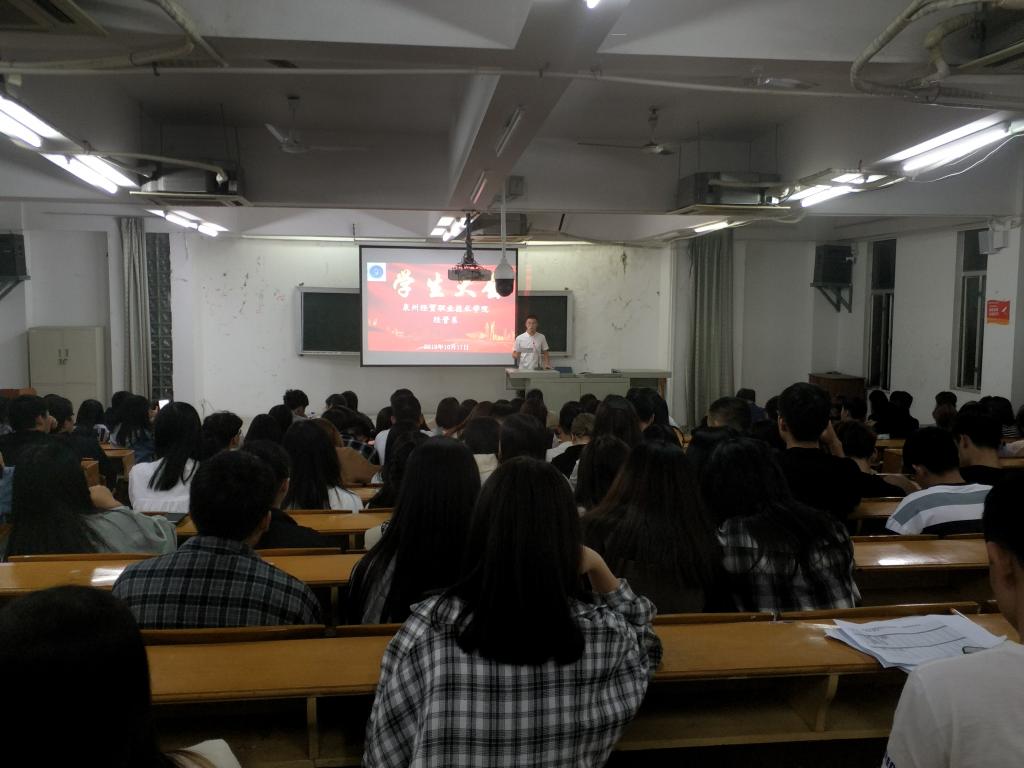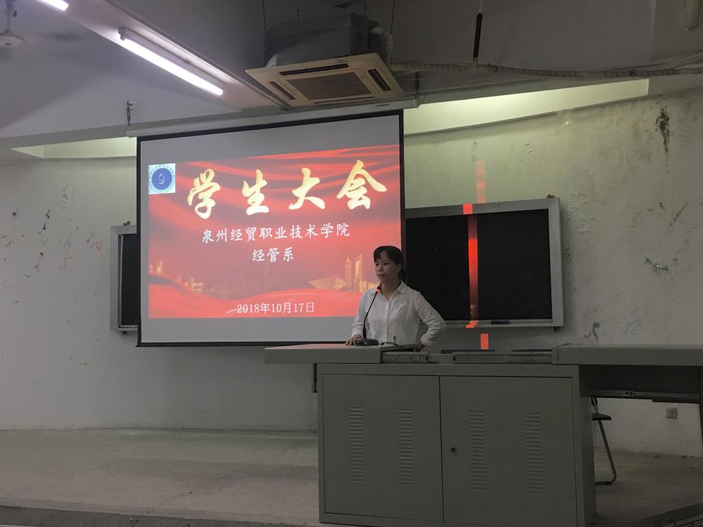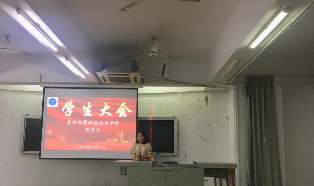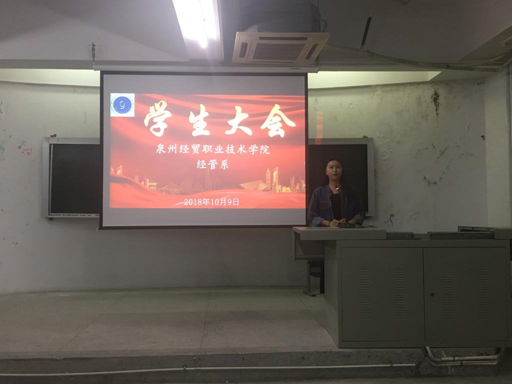 我系于2018年10月17日晚上19:00,在东教二梯举行2018-2019年新学期学生会大会。出席此次大会的有辅导员颜传香老师、团总支副书记钟淑虹、学生会主席林静、副主席陈繁玲和林思琳及学生会各个部门的部长,同时参加的还有经管系学生会全体成员。