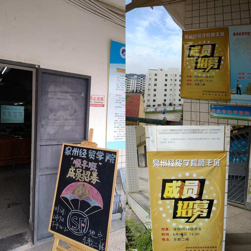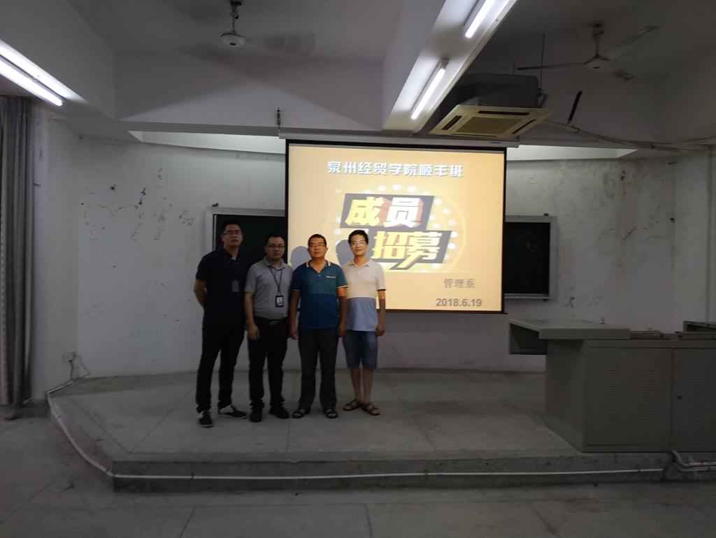 2018年6月19日下午14:30,我系在学院东教二梯举办泉州顺丰速运公司“泉州经贸学院“顺丰班”成员招募活动”。泉州顺丰速运公司人力资源发展组负责人龚茂荣等相关企业人员、我系主任张庆武老师、办公室主任黄鹏程老师出席了这次招募活动。