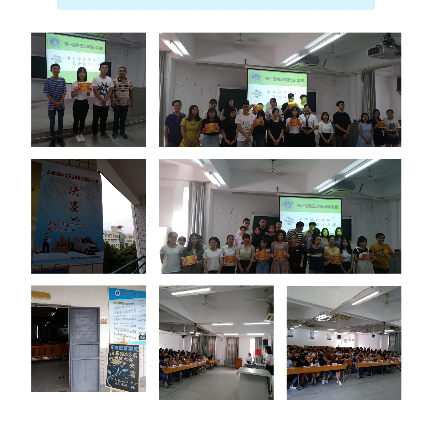 2018年6月8日下午14点30分,由经管系举办的经贸学院第一届物流方案设计比赛暨顺丰绿色环保设计大赛决赛在东教学楼二梯如期举行,本次决赛要求各团队要制作PPT,并在5-8分钟内进行讲解。进入决赛团队利用PPT展示自己的想法,诠释自己创新的点子,结合专业知识设计出各种方案。最终寻风队以89.33分获得一等奖;空降队、王子一粉丝、小森林、GTR、一枝独秀获得二等奖;校园帮、灭霸、速安组、美丽佳组、三年二班、零零零、Team获得三等奖。