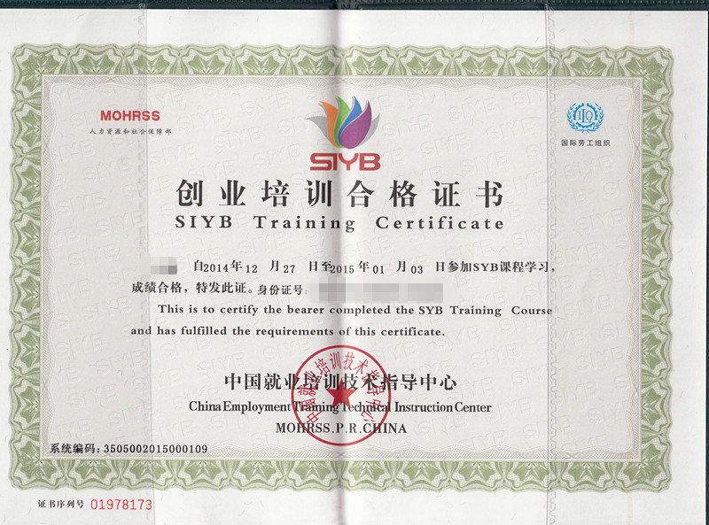 通过严格培训和层层考核,本次培训班的30为成员均以优异的成绩取得了由“人力资源和社会保障部及国际劳工组织”联合颁发的创业培训合格证书。