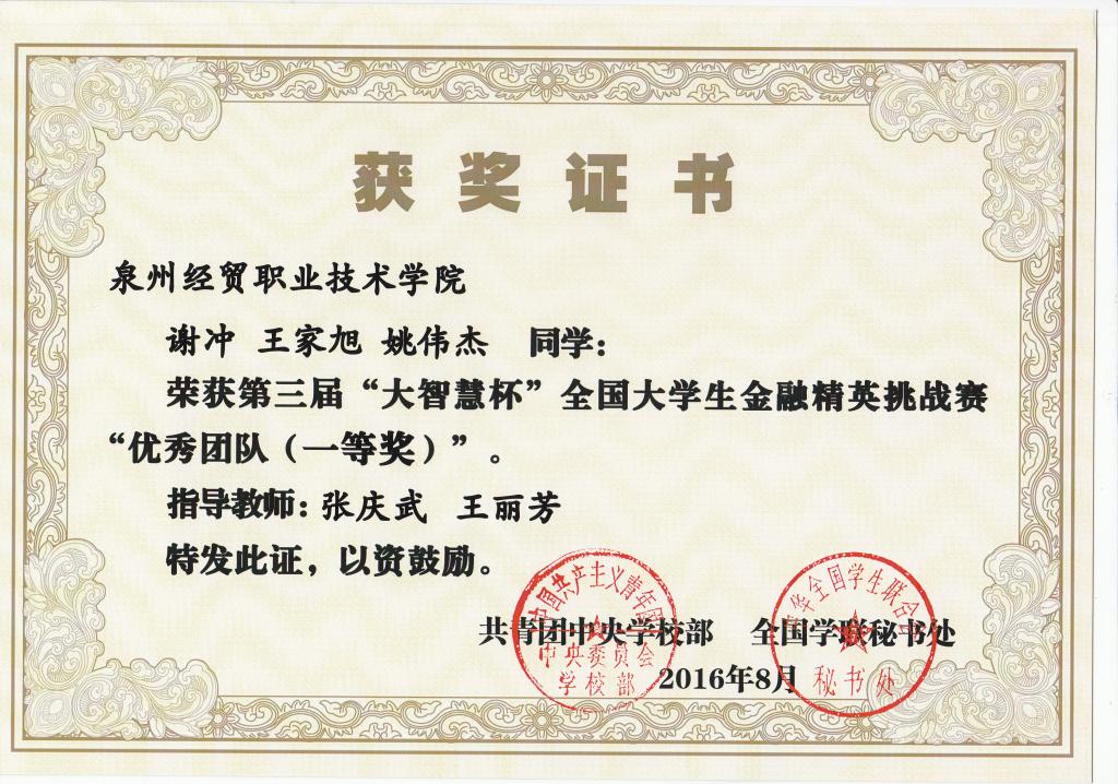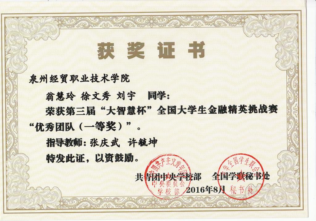 由团中央学校部、全国学联秘书处在2016年举办的《第三届“大智慧杯”全国大学生金融精英挑战赛》于9月份落下帷幕,所有结果出炉。今年的挑战赛,仍然由我系代表学院组织与承办,在学院领导的关心、支持下,在我系教师及参赛选手的共同努力下,本次大赛我院取得了极大的成功,在去年取得成绩的基础,再获佳绩。共获得一等奖2名、二等奖6名、三等奖19名,具体名单如下: