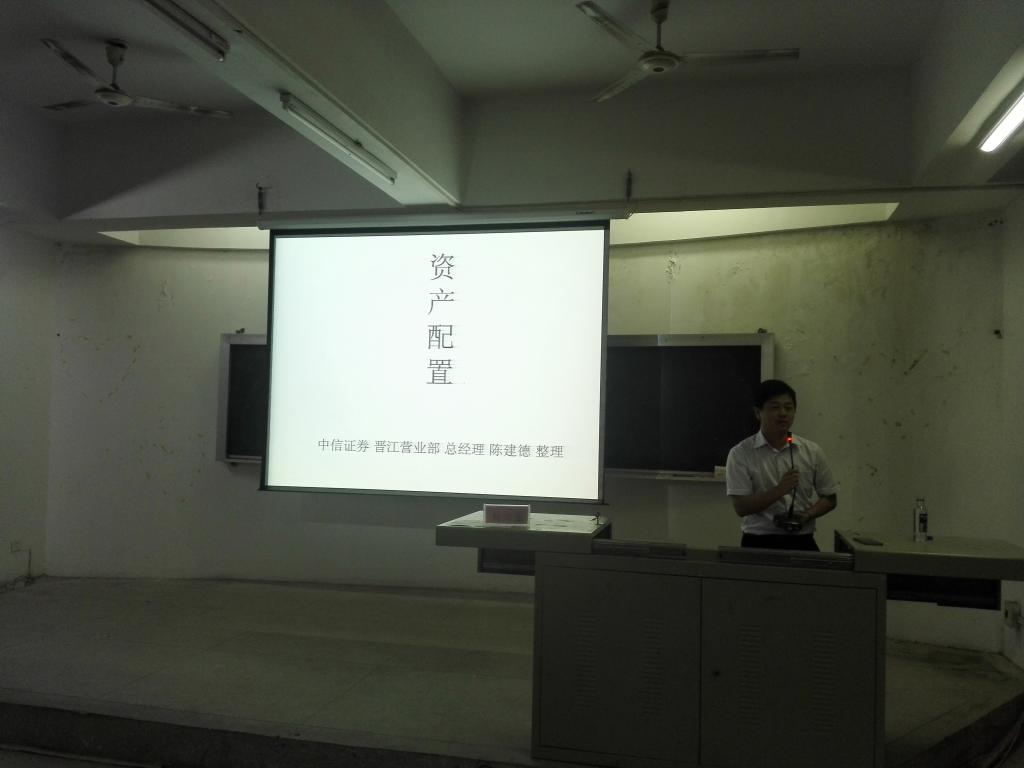 为了帮助同学们更好的了解金融市场的资产配置,了解其相关知识,2016年5月12日星期四晚上7点,在东二梯开展了关于此次金融证券投资大赛第四次也是最后一次培训讲座。本次讲座的主要围绕金融市场的资产配置展开,并特邀中信证券晋江营业部的总经理陈建德授课。