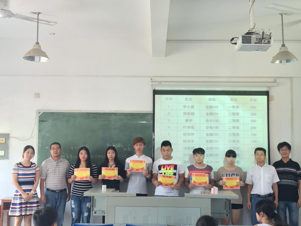 一等奖金融141班李小霞,获奖金500元;二等奖金融151班郑美娟、会计155班谢冲、会电145班叶琪瑶,获奖金200元;三等奖金融151班徐培林、金融151陈培丰、金融152汤美琪、金融142班刘鸿达、会计144班吴婷婷,获奖金100元;优秀奖有金融141班朱朝婵、金融142班周家美、金融142班周东发等数名同学,分别获精美奖品一份。大赛还分别为A股、港股、股指三个品种单项排名前两名的同学颁发单项奖。