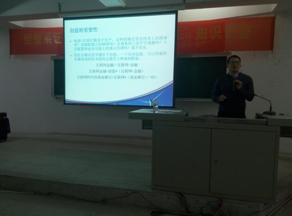讲座开始,杜院长先给金融学下了一个定义“金融学也是人学,普惠金融的主要目标是“普及城乡,惠及民主”,主要是为了帮助低收入和弱势群体。接着院长以微信红包、电影众筹和金融新领域之《大圣归来》、网商银行、跨界发展思维创新之农商银行变电商四个案例进行分析。为我们精辟的总结出:在“互联网+”中要有成就,就得一定要有创新的想法。同时在讲座中杜教授还反复的提到创新的重要性,告诉我们“当代大学生,要有自己的想法,不然很难突破”,告诫大学生要从传统的模式上勇于突破自我。最后,杜朝运教授针对创意的重要性提出了三个公式来总结:互联网金融=互联网+金融;互联网金融=创意X(互联网+金融);互联网时代的商业银行=互联网X(商业银行+一切人)。