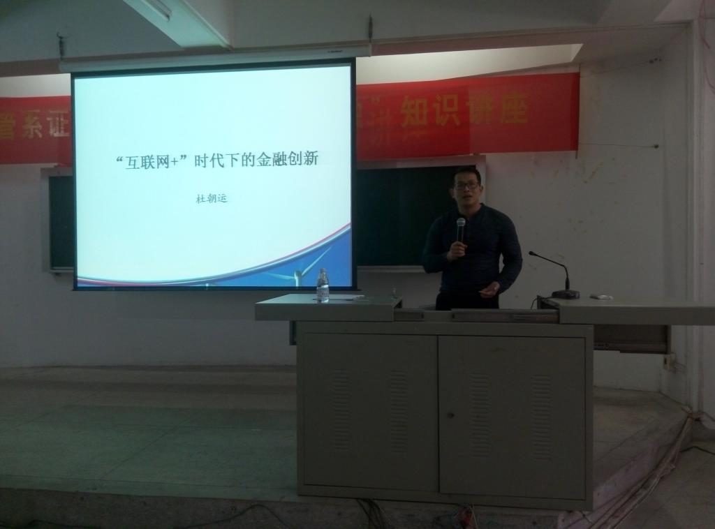 为广泛普及金融知识,让同学们深刻了解金融方面奥妙与智慧。我系特邀我院院长杜朝运教授于12月4日下午14:30在东教二梯开展“互联网+时代下的金融创新”的专题讲座。我系党总支副书记熊毅老师出席本次讲座。