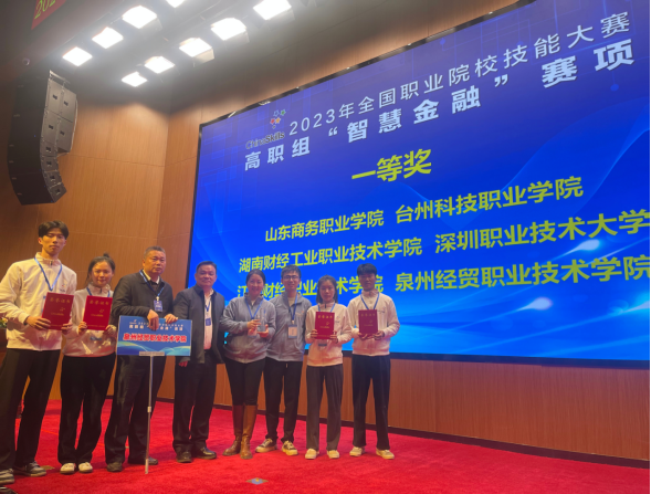 泉州经贸学院学生李玉、兰楠、朱德军、刘泽宇在2023年全国职业院校技能大赛(高职组)“智慧金融”中荣获国赛一等奖。