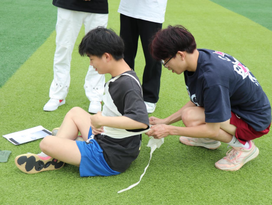 本次红色运动会分为“飞夺泸定桥”“巧运军需”“支援前线”“朱德的扁担”“送鸡毛信”等五个项目,同学们热情参与、团结协作。在“支援前线”中,参赛队员们在玩中学,两两配合“包扎”,切实掌握实用的包扎技能。在“朱德的扁担”中,参赛队员默契配合、沉着冷静地用扁担运送草垛,重温当年红军运输粮草的艰难与不易。