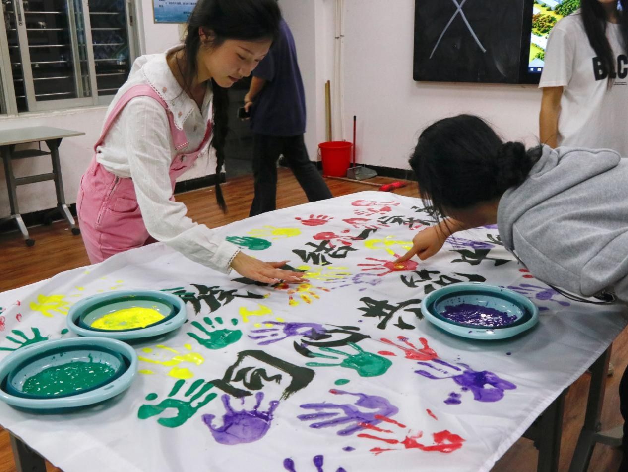 在比赛的最后阶段,同学们纷纷在画布上按上手印,传递着团结的力量。
