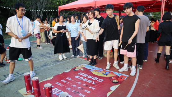 同学们早早来到篮球场前排好队签到并拿集章卡。学生会志愿者们耐心地讲解本次游园会的内容和游戏规则。本次游园会设置了众多的游戏摊位,管理系学生会志愿者们担任现场游戏摊位的大当家,带领同学们积极参与猜灯谜、投壶、套圈、博饼等各种趣味游戏。在一片欢声笑语中,齐齐体验中秋喜悦氛围。
