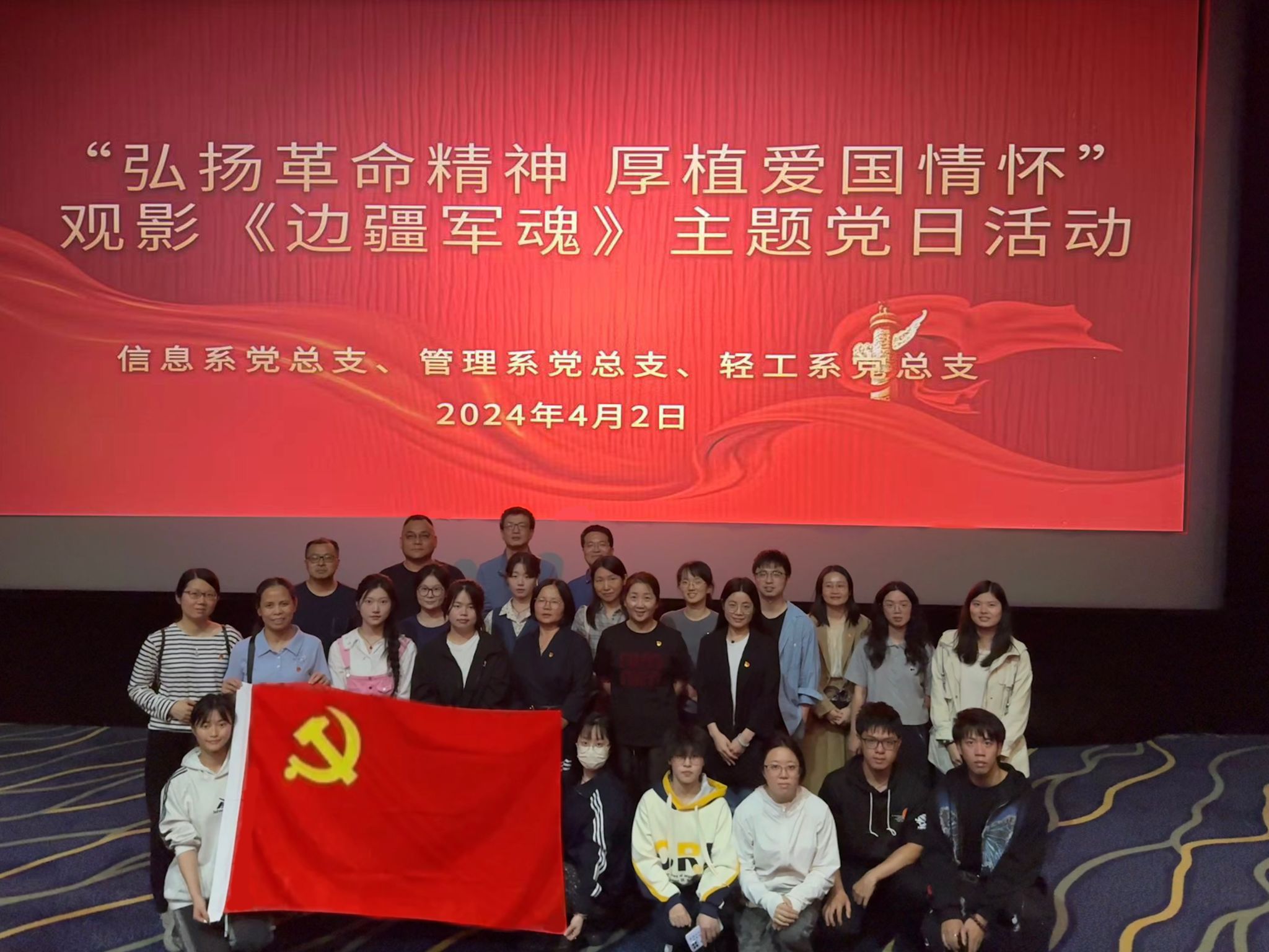 为进一步推动学习贯彻习近平强军思想走深走实走心,增强师生党员国防观念、强化忧患意识,4月2日,信息系、管理系、轻工系党总支联合开展“弘扬革命精神,厚植爱国情怀”主题党日活动,组织党员师生前往横店电影城集中观看国防教育片《边疆军魂》。