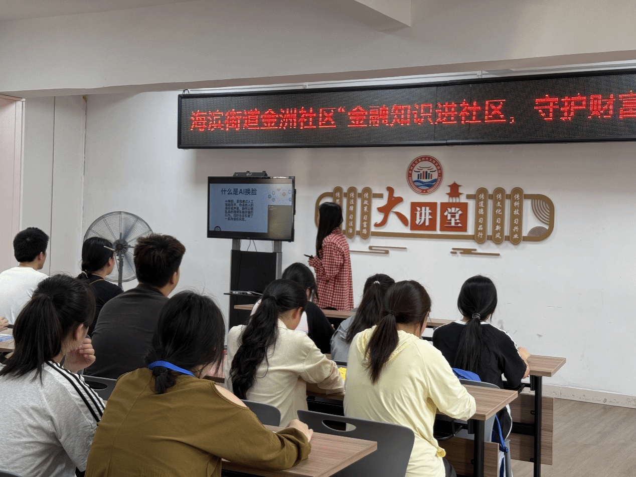 党员教师张雨和入党积极分子以讲座的形式向社区居民介绍了AI换脸和电商诈骗等新型的诈骗形式,并传授了货币识假的相关技能。为了让大家更好地掌握金融防诈的相关知识,现场还设置了有奖问答环节,居民们积极参与,气氛热烈。