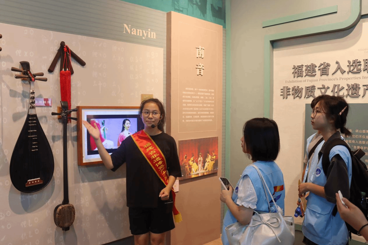 随后参观了福建省非遗博览苑和福州市非物质文化遗产展示馆,志愿者讲解员为团队详细介绍了福州脱胎漆器髹饰技艺、寿山石雕、闽剧等国家级非遗项目。展馆内,习近平总书记曾调研非遗项目的珍贵照片和讲话摘要,让师生们深切感受到国家对非遗保护的高度重视。