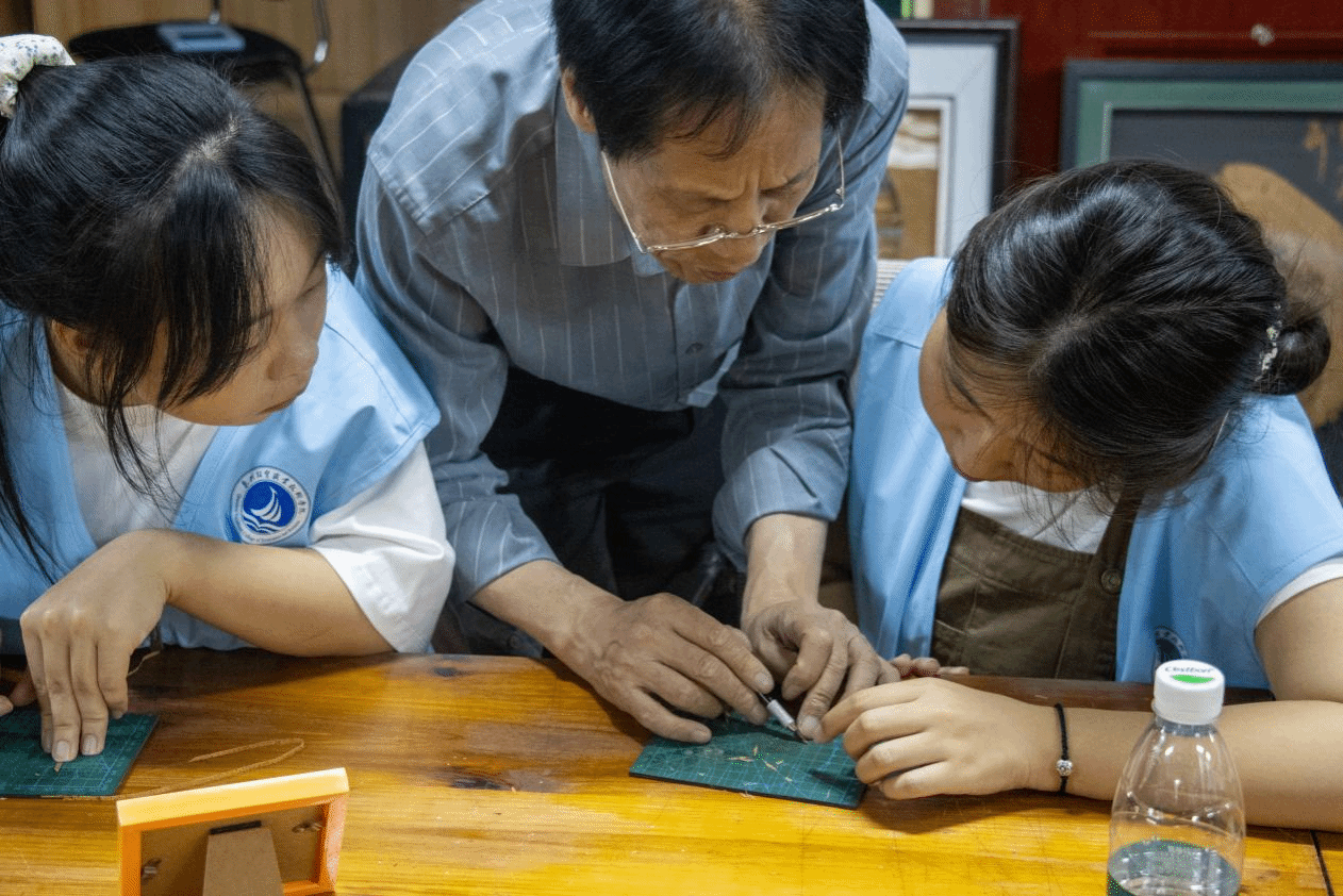 最后前往西园软木画生产基地动手学习,福州软木画代表性传承人陈君锟现场演示“以刀代笔”的精湛雕刻绝技,手把手指导师生完成作品创作。“每件作品都要经过多道工序,这就是工匠精神”。学生代表李宜凡感叹:"非遗传承不仅是技艺的延续,更是精神的传承。"